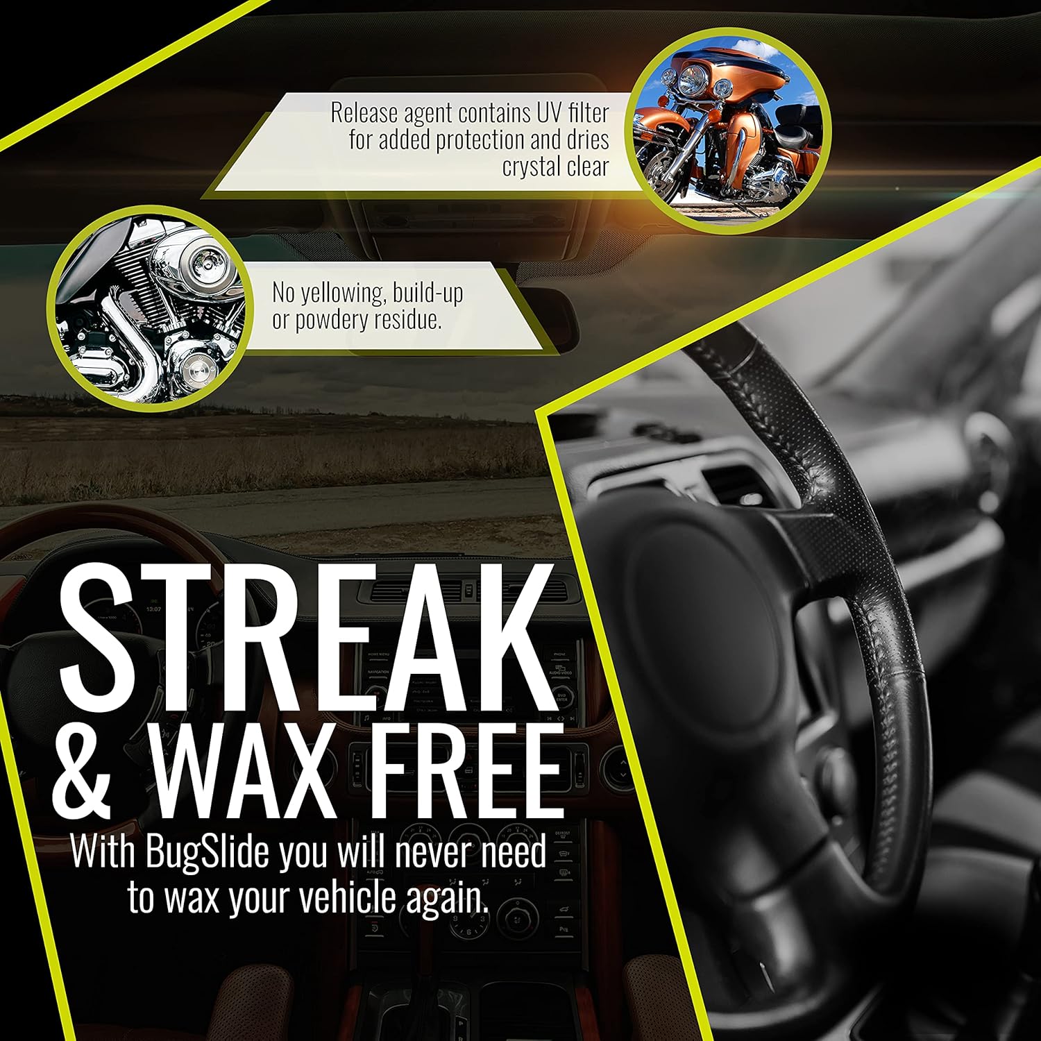 - Streak and Wax-Free β With BugSlide you will never need to wax your car again. Applied and paired best with a microfiber cloth towel to wipe clean, the release agent contains a UV filter for added protection and dries crystal clear with no yellow tint, film, build-up or powdery residue.