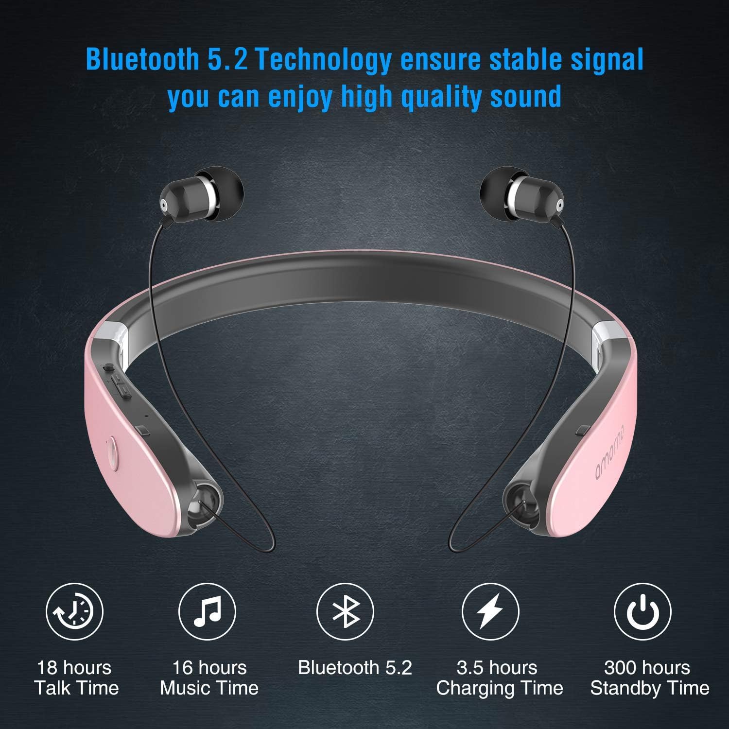 - [Long Lasting Battery Power]: AMORNO Bluetooth neckband headphones can provide 16 hours music play time, 18 hours talk time and 300 hours standby time after 3.5 hours single full charge, you can use it for all day work or enjoy long lasting music, battery power status can be checked in your device, very conveniently.