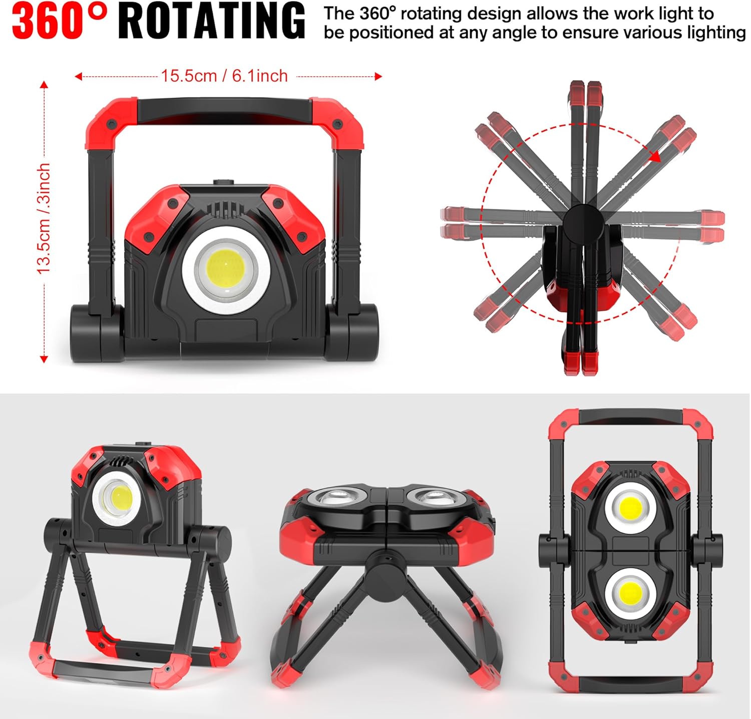 - [ 5 Light Modes - Upgrade Red Mode ] - With 5 light modes(double COB high light mode - single light mode - other single light mode - double COB low light mode - red strobe mode), the rechargeable flood light provides brighter light with larger area. It is a great equipment for emergency situations on the roadside in red strobe mode.