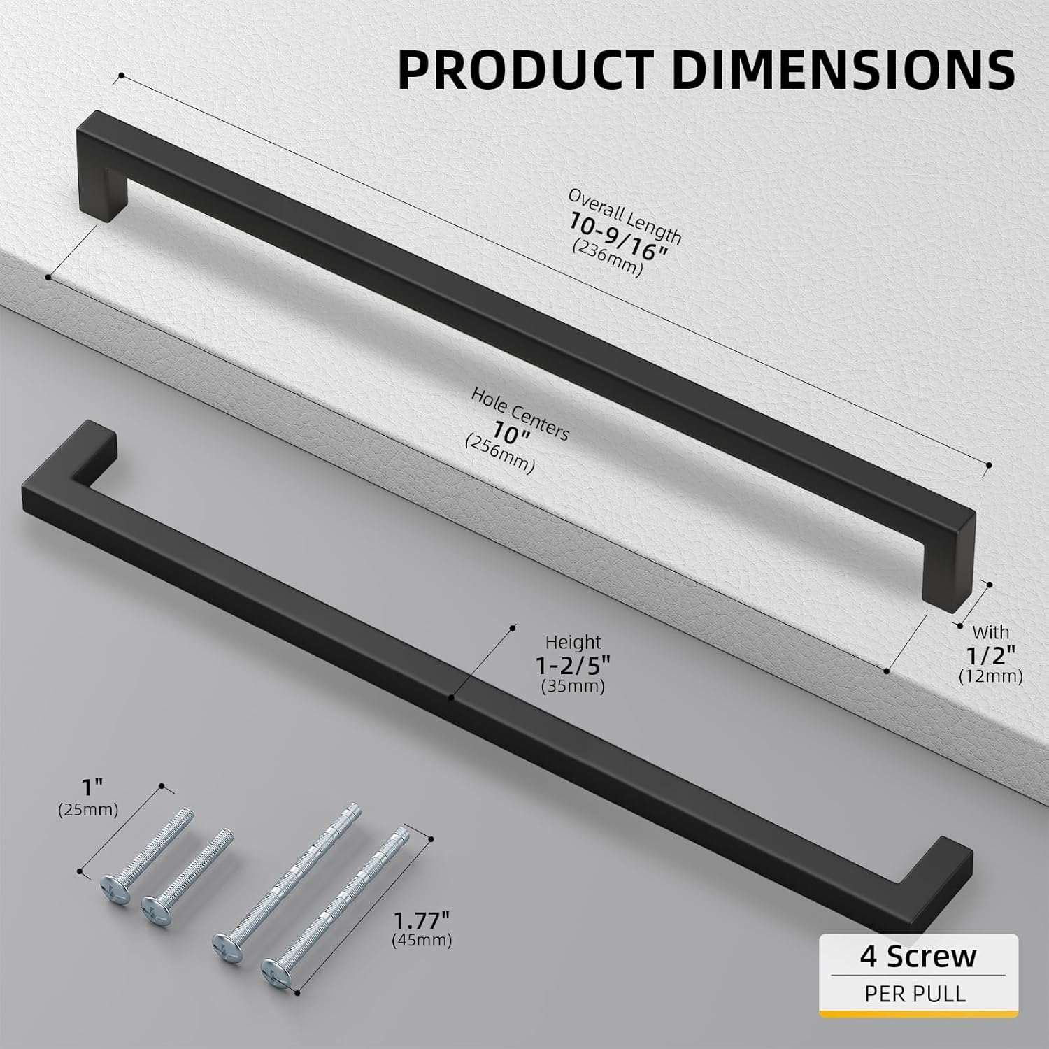goldenwarm 45 Pack 10 Inch Black Cabinet Handles Matte Black Drawer Pulls Stainless Steel Cabinet Hardware Square Bar Modern Cabinet Handle for Kitchen Bathroom Cupboard