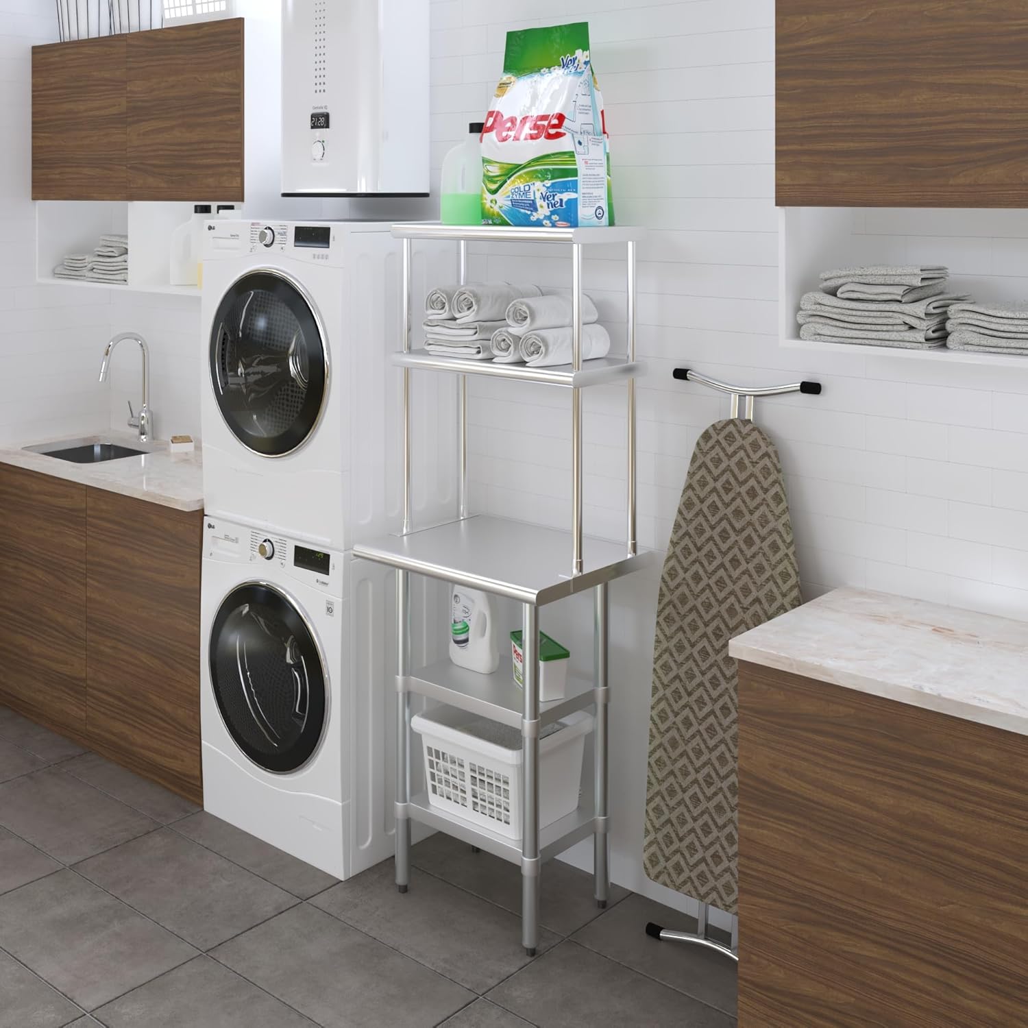 - WORK SAFETY: Work table top and double tier adjustable shelves are constructed from 18-gauge stainless steel, making this restaurant prep and serve table and double tier shelf combo set is durable and long lasting. The table top comes with a galvanized under-shelf for additional storage and adjustable legs for convenience. This table and shelf set is specifically designed and finished for use in a commercial or industrial setting, but is just as reliable in the home.
