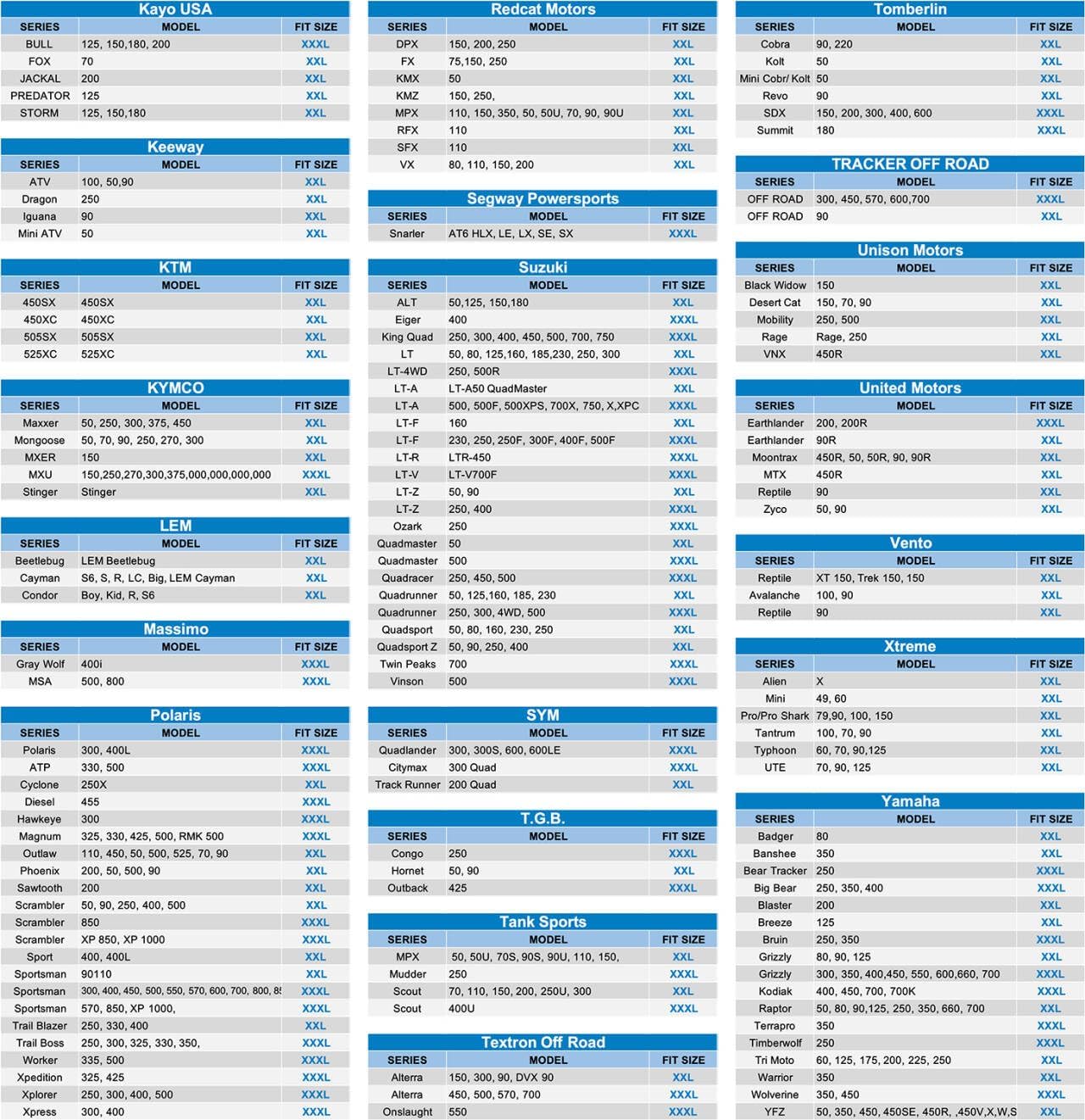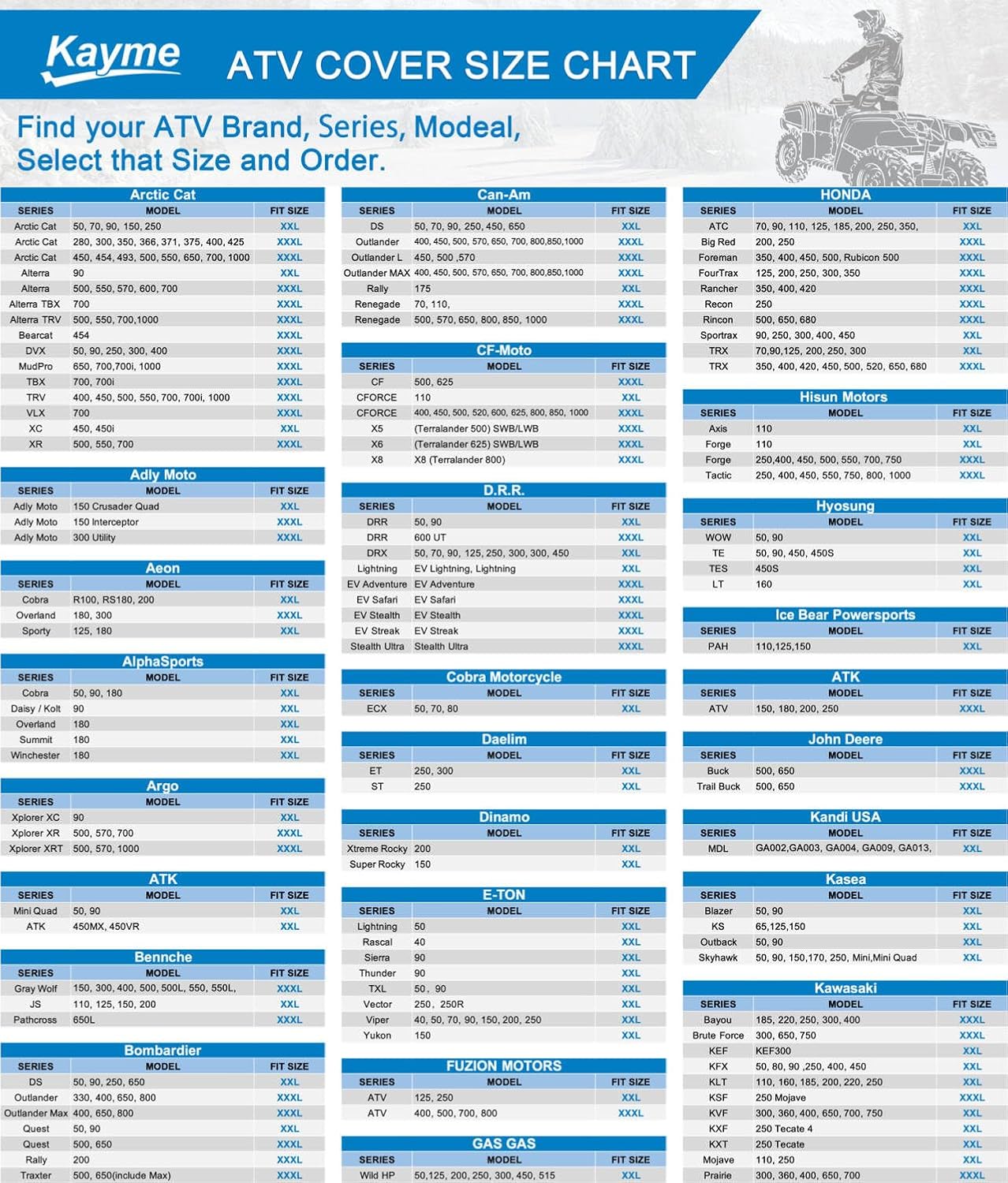 - ăXXXL Universal sizeă XXXL-100''L x 43''W x 48''H. ATV cover fit for most ATV. Suit for Polaris,Raptor, Ranger, Suzuki, Honda, Kawasaki, Yamaha, Can-am outlander ATV and more. (To ensure the right size, please measure your ATV before purchasing)