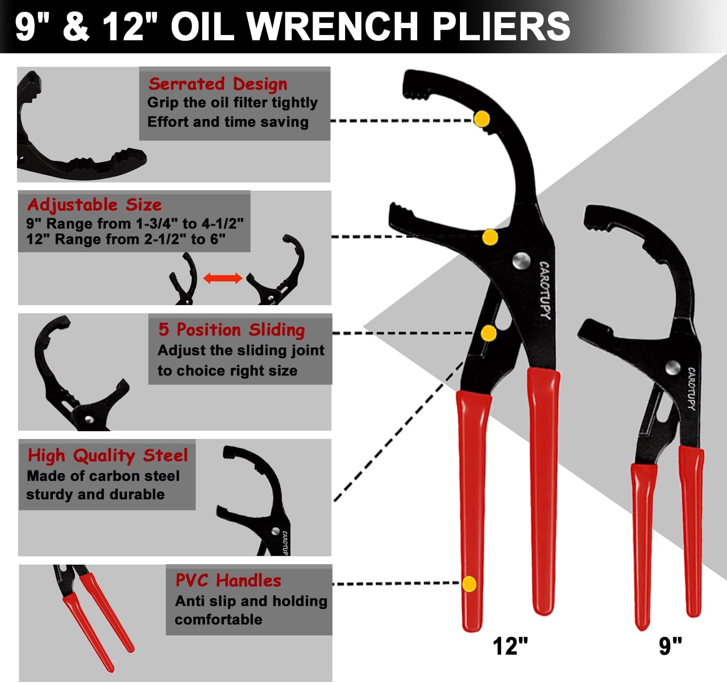 - Multi Sizes Tool: The sizes of oil filter wrenches range from 2-1/16" to 5-1/4", and the adjustable oil filter pliers include 9" and 12" fit filters from 1-3/4" to 6", can use for various dimensions of oil filters replacement for home use or repair shops.
