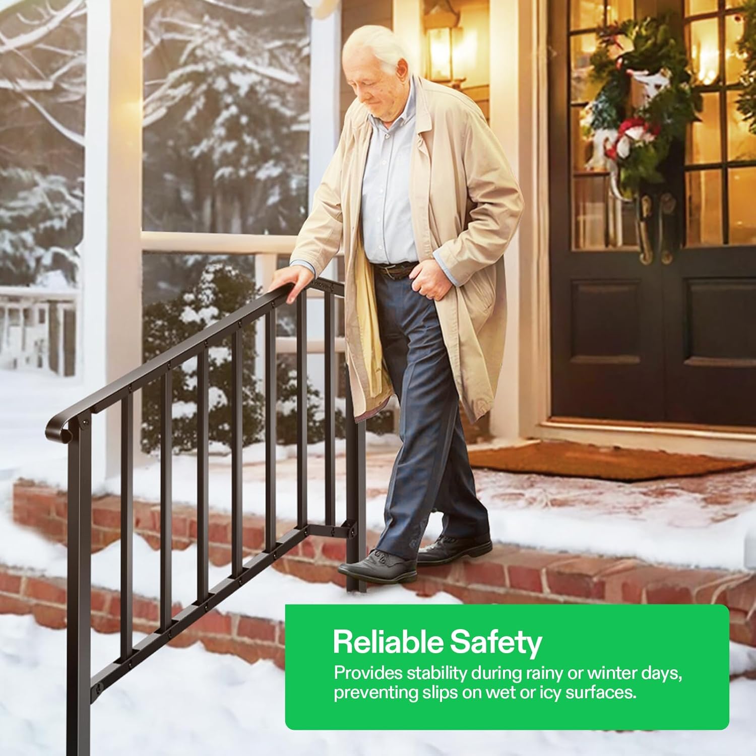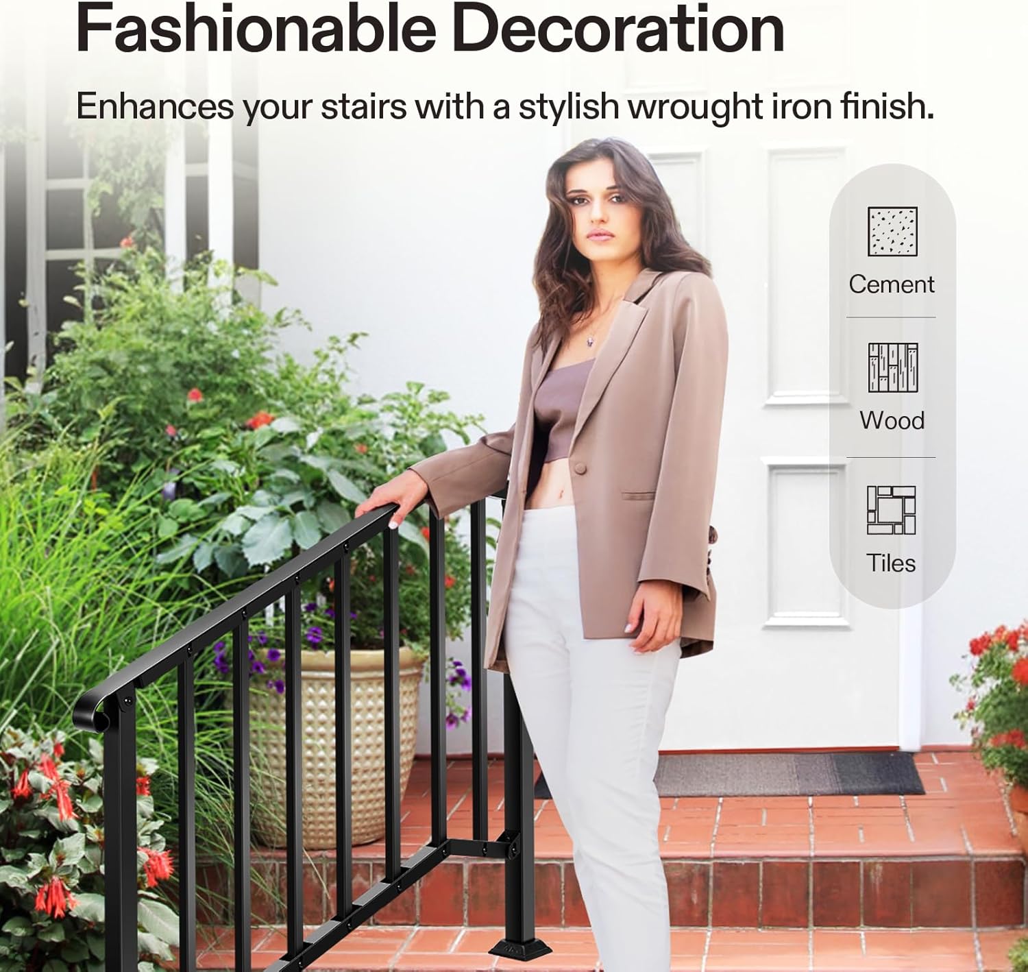 - Sturdy & Durable: Made of high-quality iron for stability and durability, this handrail withstands harsh outdoor conditions, including rain and snow; Thick black powder coating reduces chance of peeling off, rust, scratches, and discoloration, making the railing easy to maintain and clean