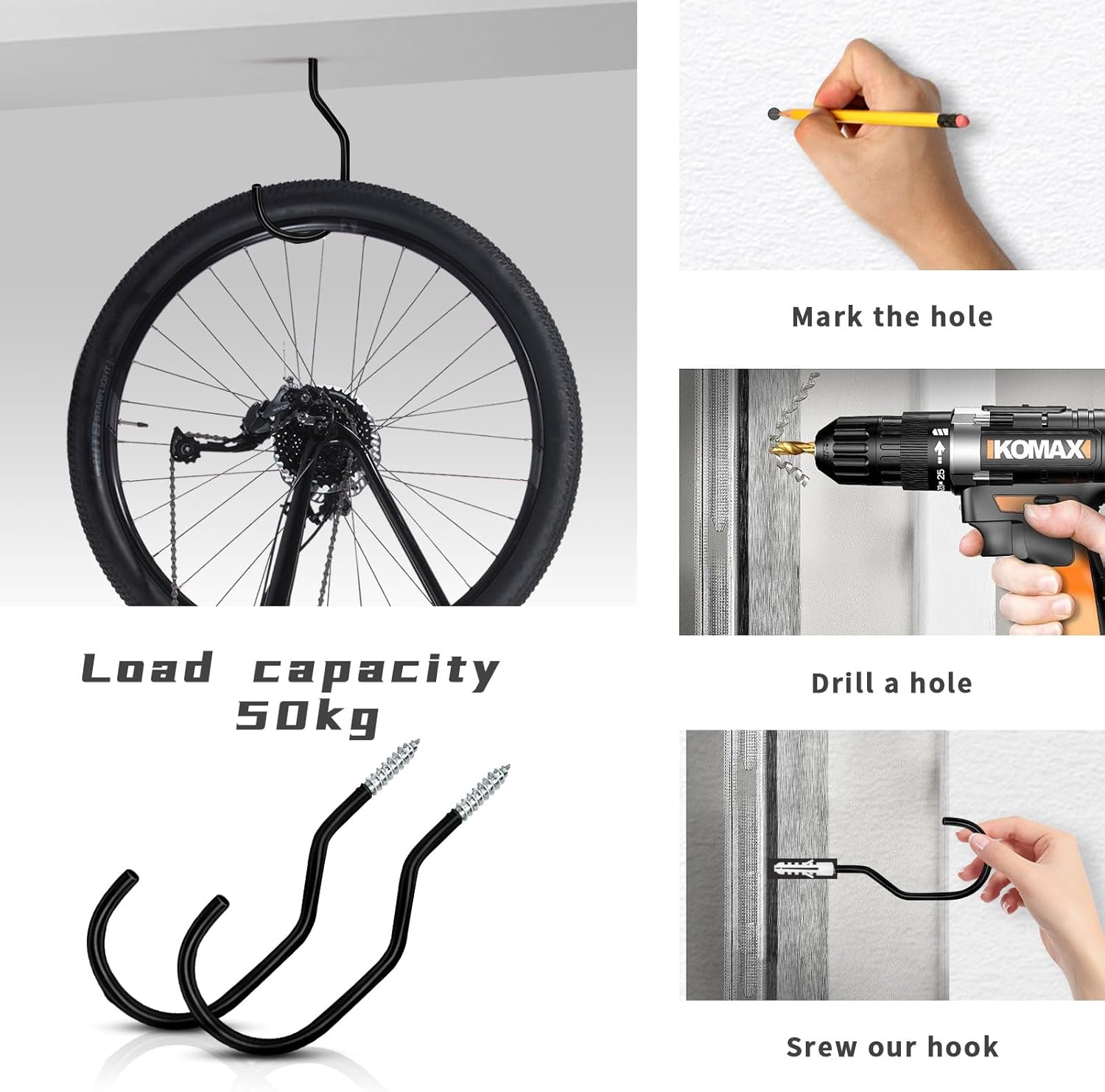 - 【Wide Application】These hooks can be used in different scenarios, suitable for garages, homes, warehouses, gardens, basements, tool rooms, street store displays, indoor or outdoor, etc., suitable for hanging various types of bicycles, mountain bikes, road Bikes, kids bikes, exercise bikes and more.