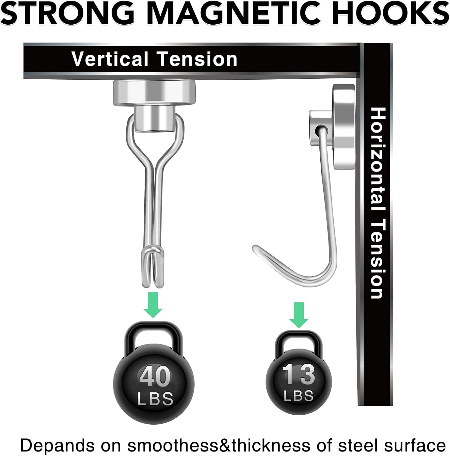 - 【Hanging Capacity】- Heavy duty magnetic hooks are made of neodymium magnets offer more than 40lbs pulling force on horizontal application, reduce to nearly 13lbs if used vertically. Whether you want to hang bags or other items, our magnetic metal hooks will securely attach to any metallic surface.