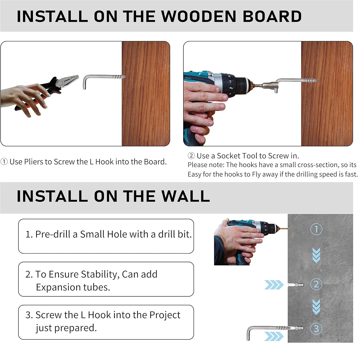 - 【Please note】 The threaded end is sharp, but you can pre-drill holes in the wall/post/board when installing, so you can easily screw the hook into the holes manually or with a tool.