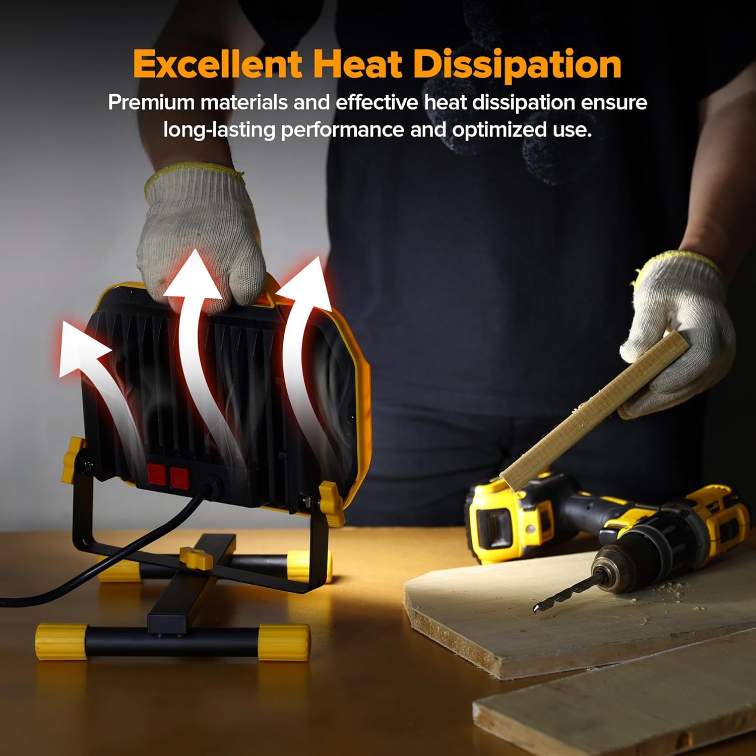 - 【IP65 Waterproof & Long Lifespan】 The job sites light features IP65 waterproof, enabling it to be used in humid environments without aging or damage. Additionally, the die-cast aluminum housing and efficient heat dissipation structure ensure a lifespan of up to 100,000 hours, significantly reducing maintenance and replacement costs.