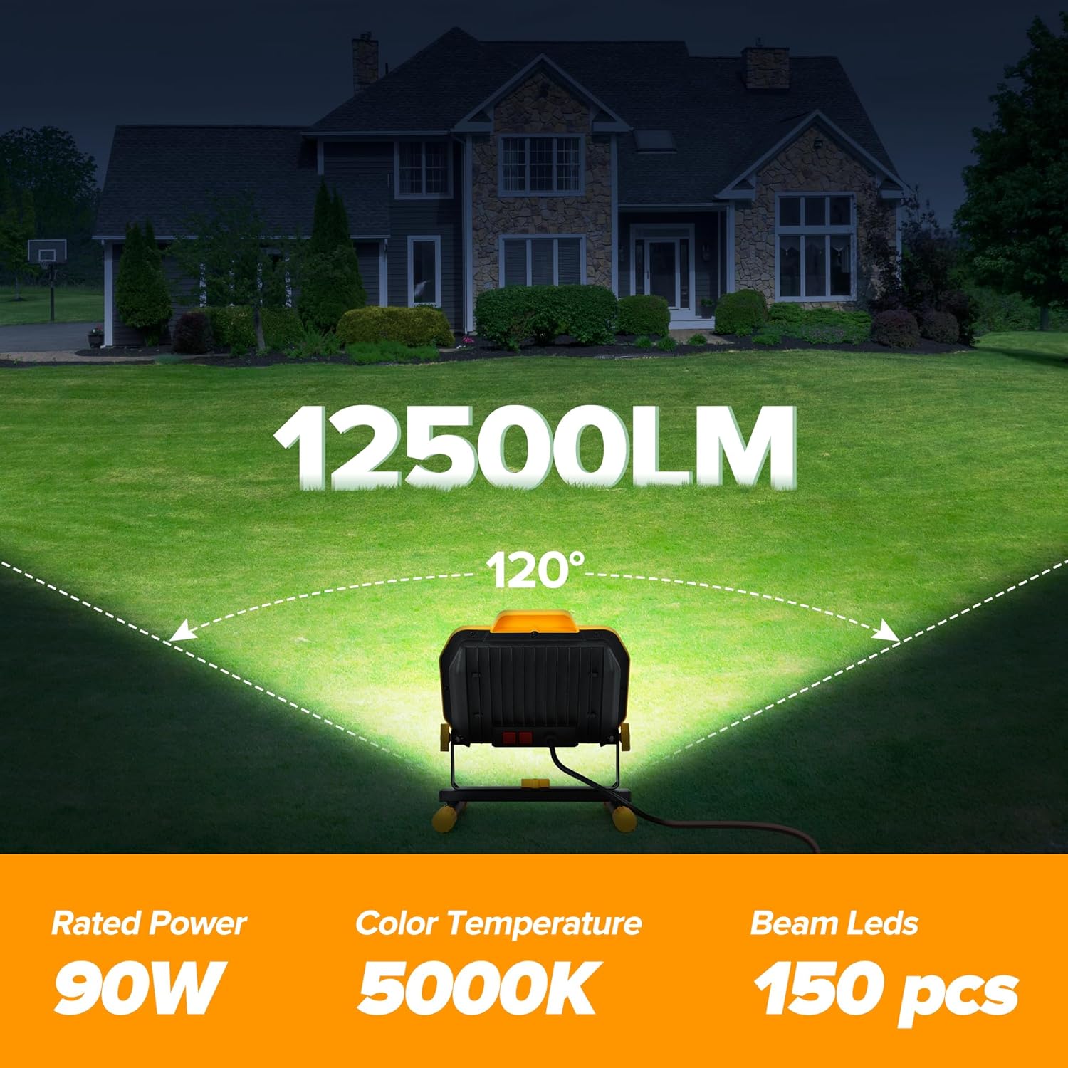LUTEC 12500 Lumen LED Work Light, Dimmable Flood Lights with 3 Brightness Levels, IP65 Waterproof Portable Job Site Lights with Stand and 5 Ft 3-Prong Power Cord for Workshop Garage Construction Site