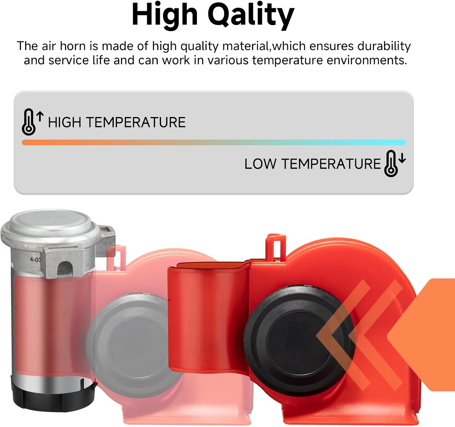 - 【Innovative Design】Our air horn features an extremely powerful directly injected mini-compressor paired with a snail design, up to 150DB ! The sound is harmonious, loud enough, and the sound quality is excellent. All integrated into one small but powerful device