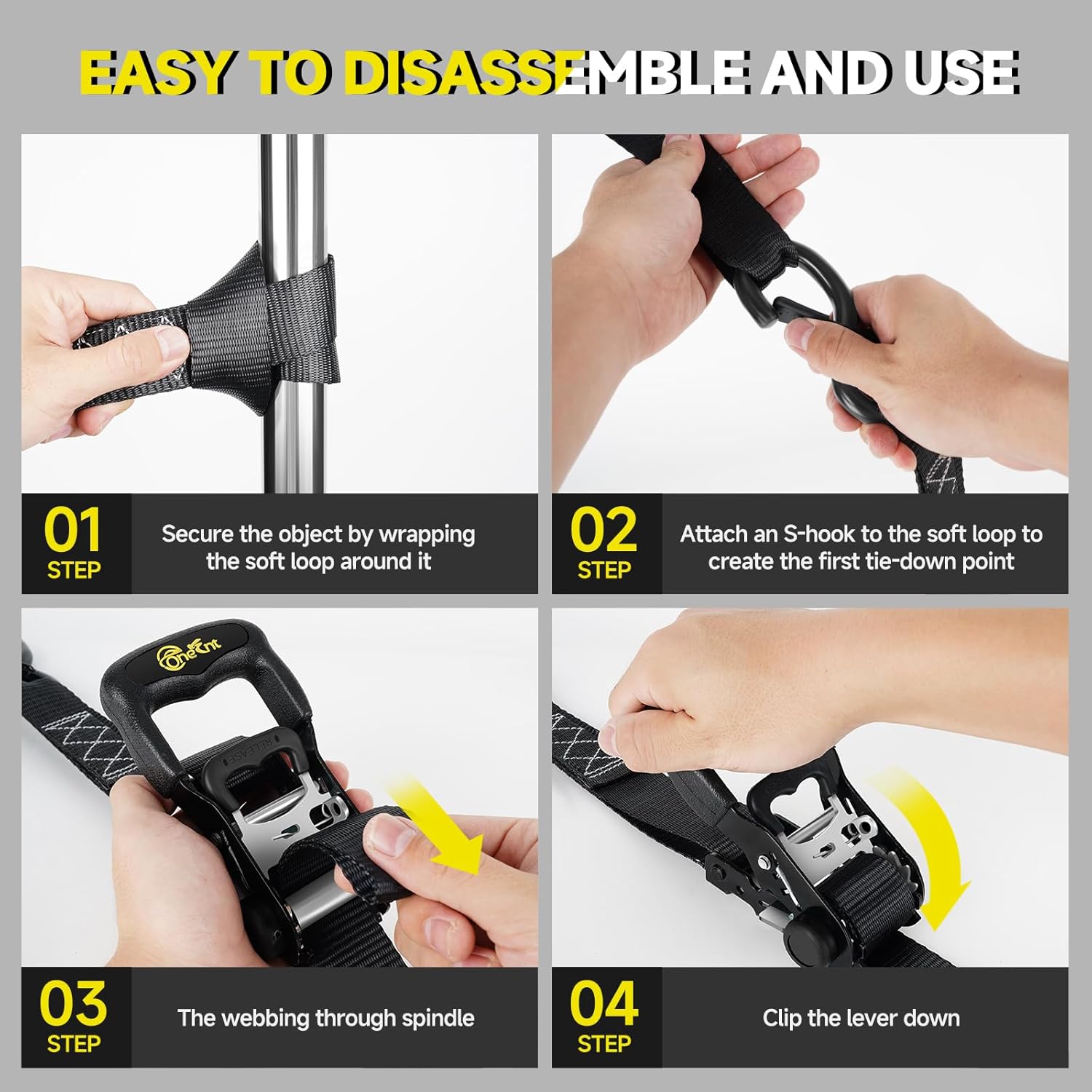 • Package Included : 4Pcs 1.6” x 10’ Ratchet Straps with Padded Handles,4Pcs Coated S Hooks, 4Pcs 18” Soft Loop