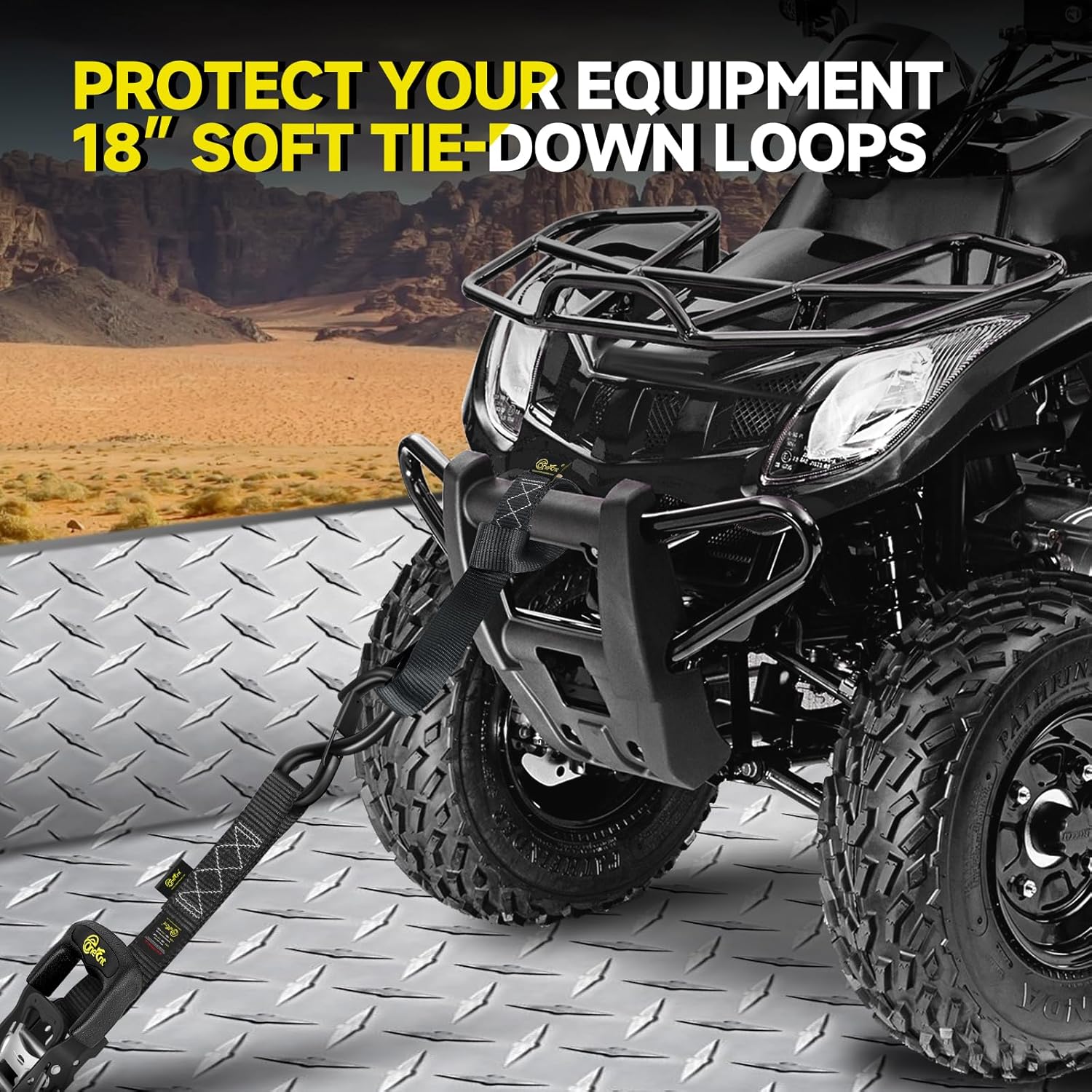 • Upgraded Ratchet Strap Kit : Our powerful tie-down strap kit includes (4) sturdy 1.6” x 10’ ratchet straps with padded handles, coated S-hooks with safety clips, and (4) 18” soft tie-down loops, all extended and thickened for ultimate reliability and ease of use.