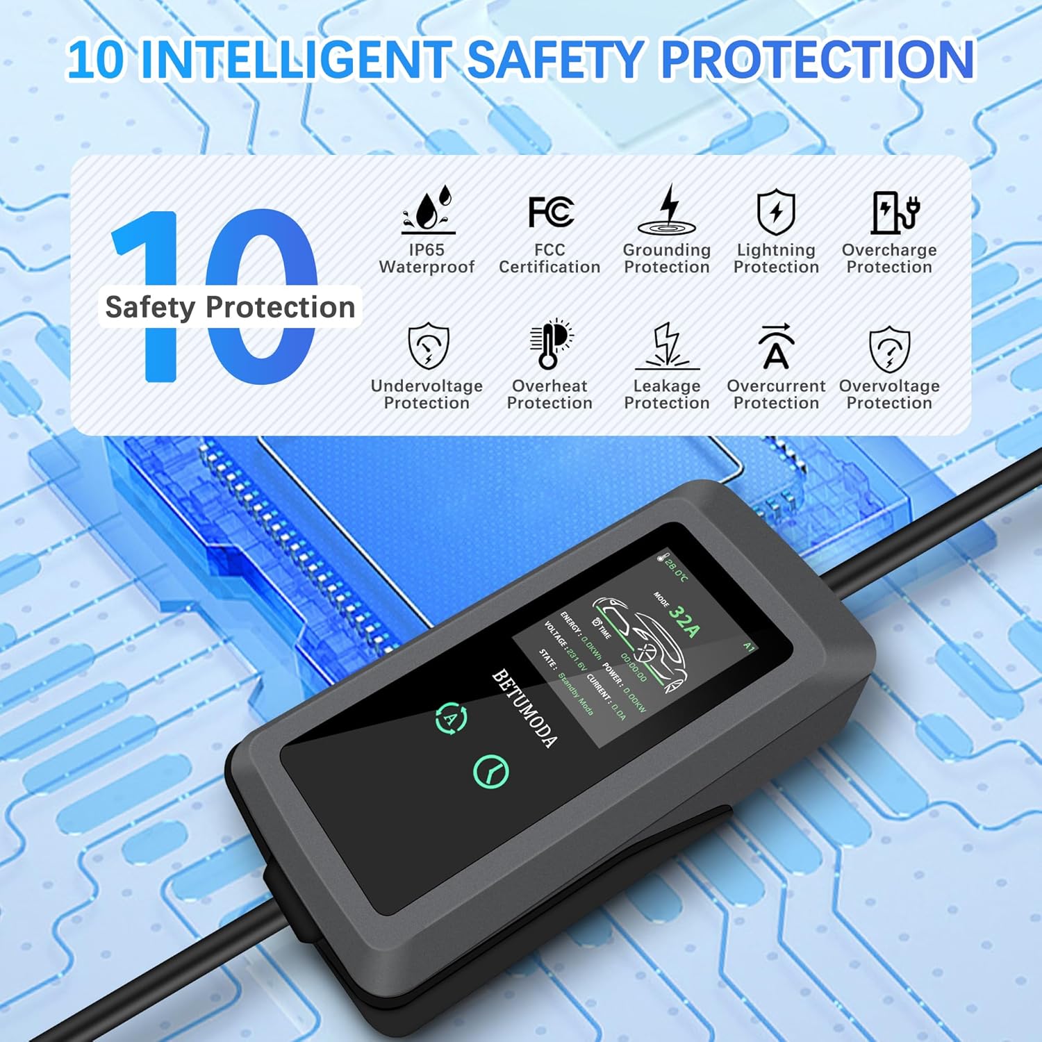 - Smart Charging:Schedule your charging sessions during off-peak hours with the 32 Amp EV charger to save on your electricity bill. The 2.8-inch LED touch display allows for real-time monitoring of charging current, voltage, and power, making it easy to manage your charging status and history. You can also touch the screen to select different current settings and charging times. In case of any errors, they are swiftly displayed on the LED screen, enabling rapid troubleshooting.