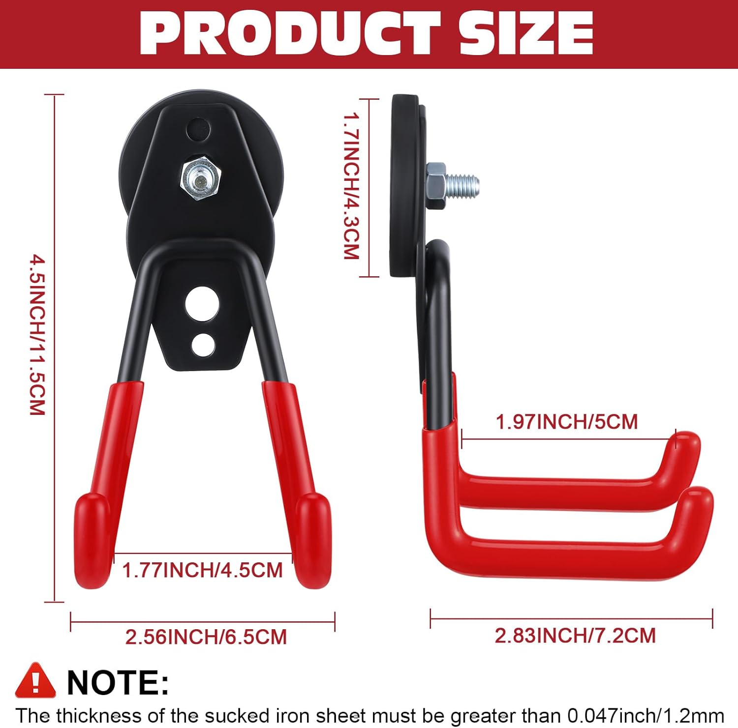 - Easy to Install: no need to use any tools, and the magnetic hooks will not break the surface; The red magnetic hooks can be placed directly on the metal surface; Please note that the thickness of the sucked iron sheet must be thicker than 0.047 inch/ 1.2 mm; Or else the magnetic hook will slide off