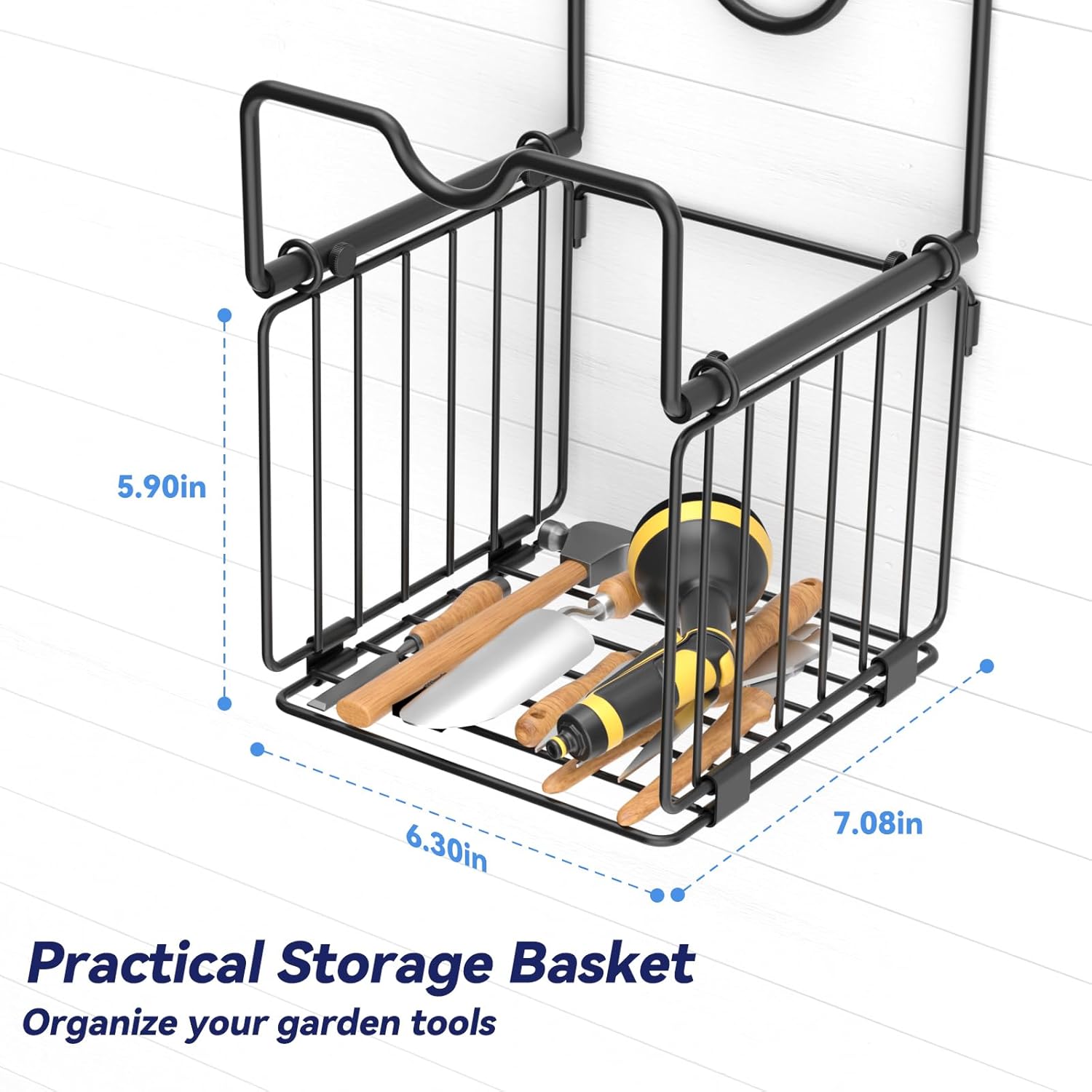 - ALL-IN-ONE GARDEN HOSE HANGER - The hose hanger wall mount will keep your garden tools & hoses perfectly organized! With spacious design (6.3"x7.08"x5.09") , the water hose storage can hold hoses, water/gas pipes, electric wires, PLUS adapters, rakes, shovels & more!