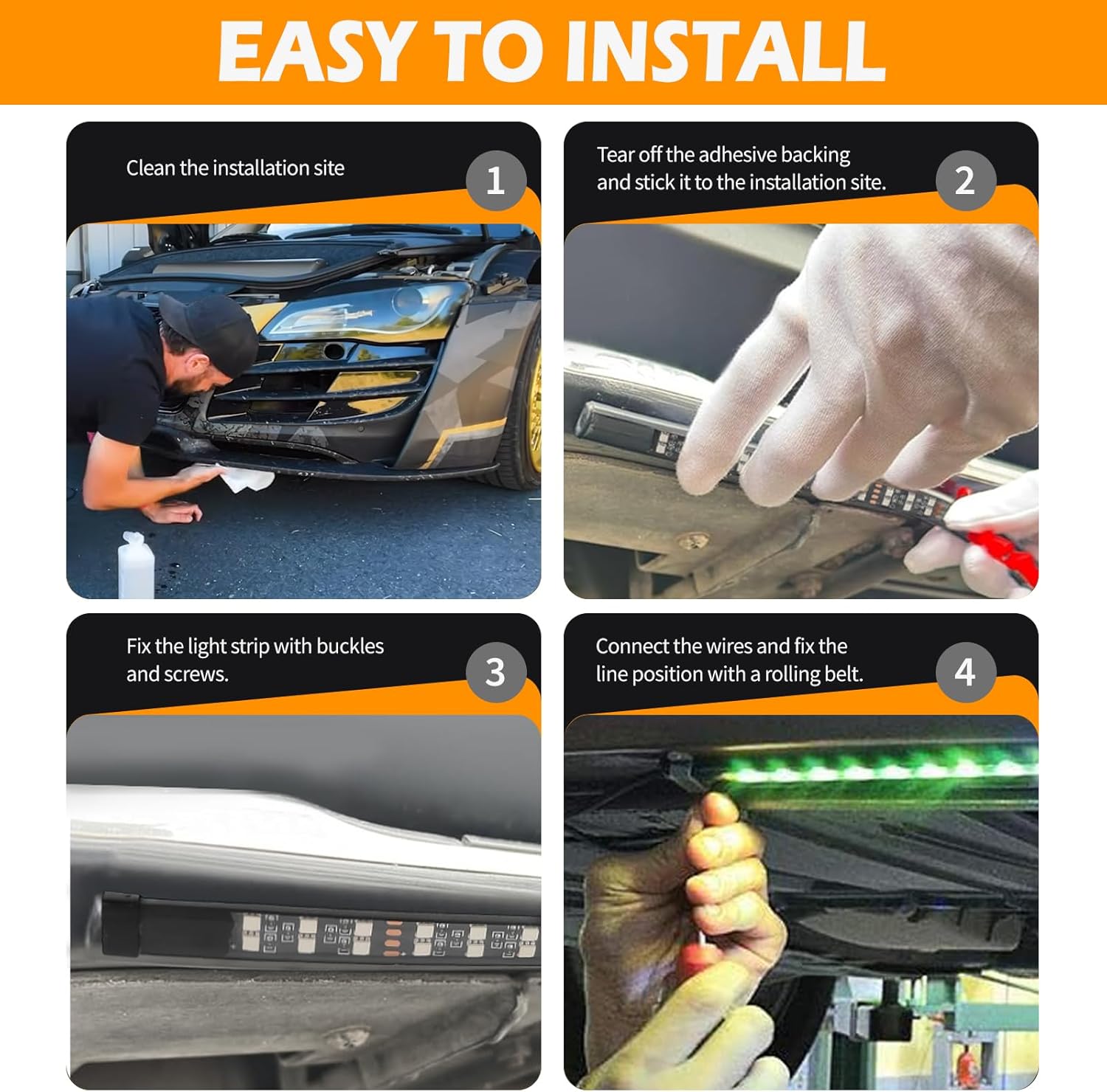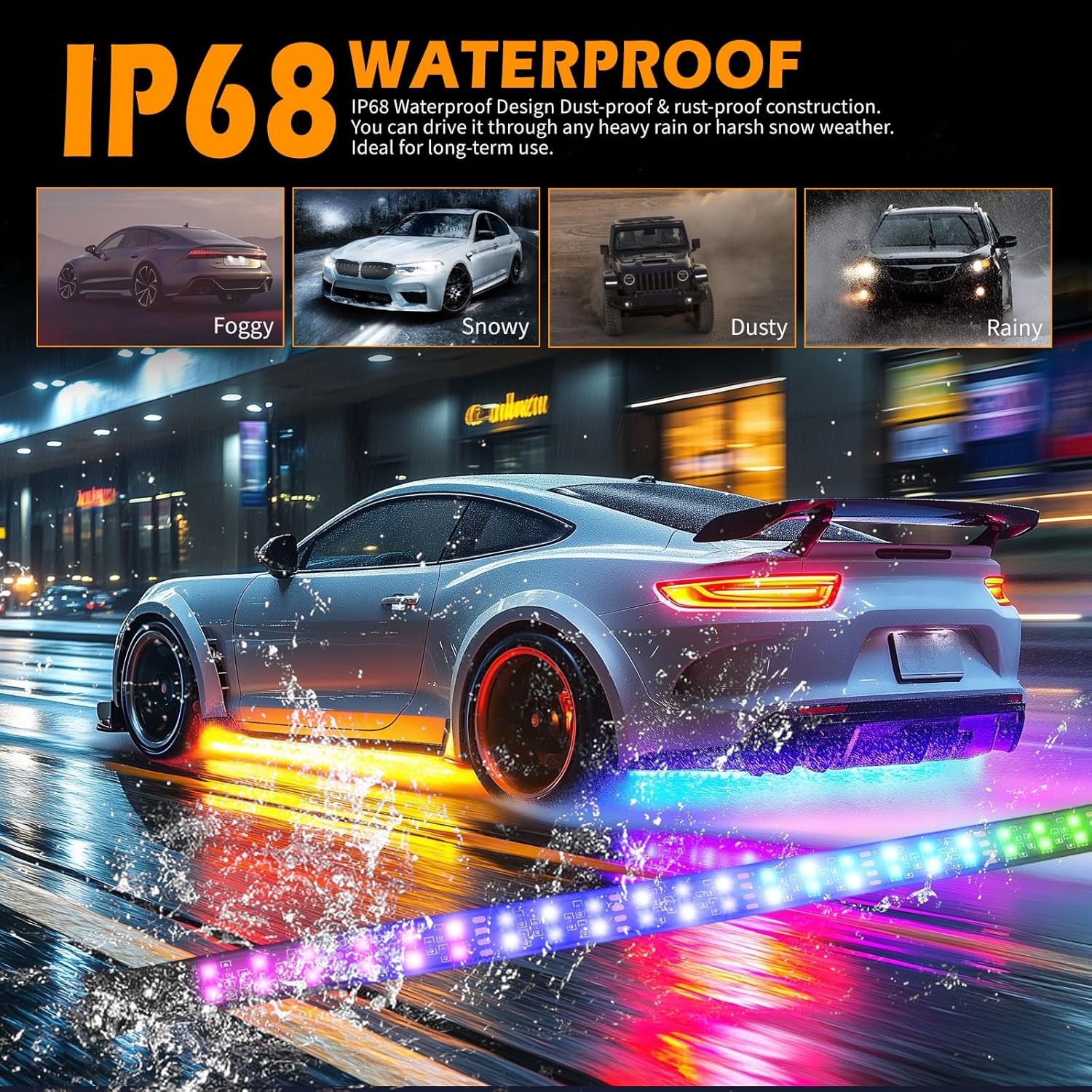 - ăIP 68 Waterproof & Strong adhesiveă: Exterior car LED light strips made of Flexible Rubber Tubing IP68 waterproof material, completely sealed by transparent shell,protect the car underglow strip lights to work well on any weather condition. In addition, strong adhesive and cable ties ensure stable installation. Even driving through lots of rain, highway speeds, potholes, the LED strips can still stay on and work great.