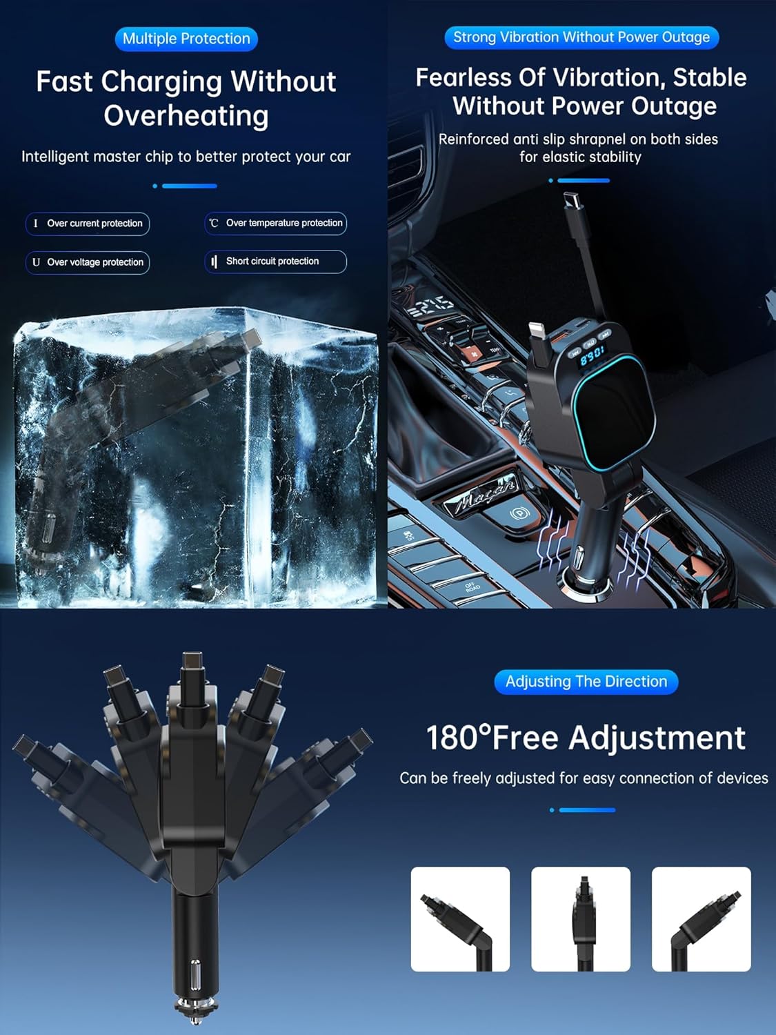- ā : The Ultimate Multi Device Charging Car Organization : Car Charger USB C with Bluetooth Car Adapter- The 4 in 1 Retractable Car Charger with dual USB ports and versatile cable provides complete charging solutions. Perfect as truck accessories for men or gifts for drivers, this USB C Car Charger ensures fast charging for iPhone 16 Pro Max and Android devices. Keep your Car Charger-powered vehicle clutter free with smart organization.