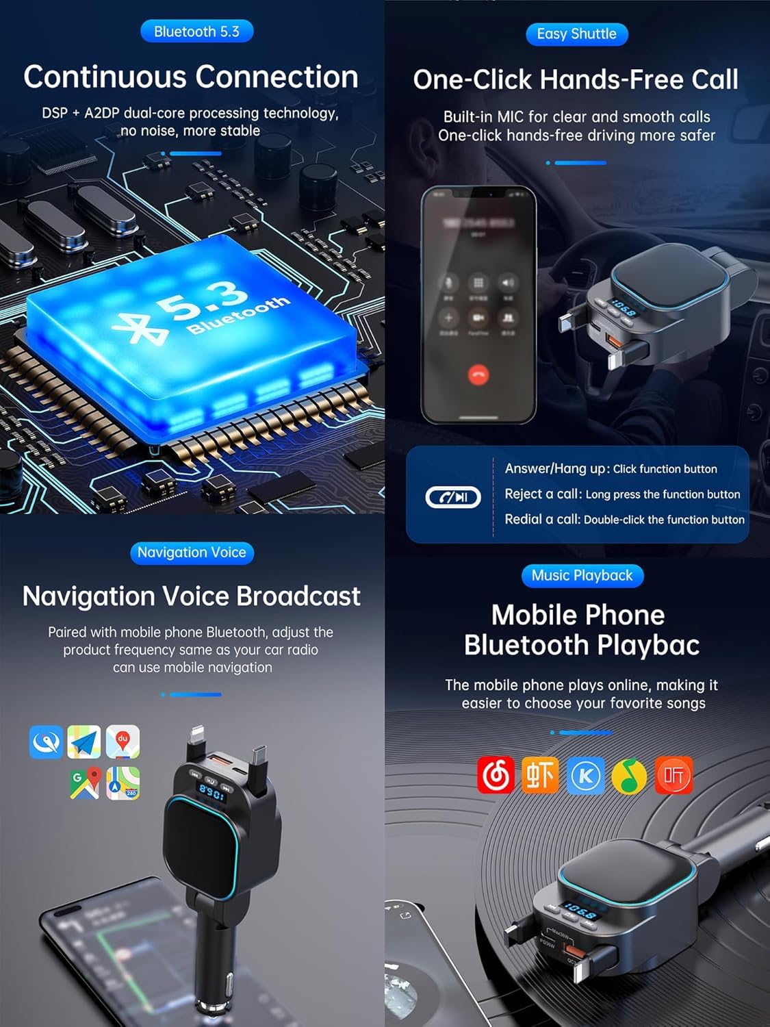 Retractable Car Charger 96W with Bluetooth Car Adapter, 4 in 1 Fast Charging, Radio Bluetooth 5.3 FM Transmitter, Handsfree Calling, USB C Phone car Charger Adapter for iPhone 16 15 14 13 12