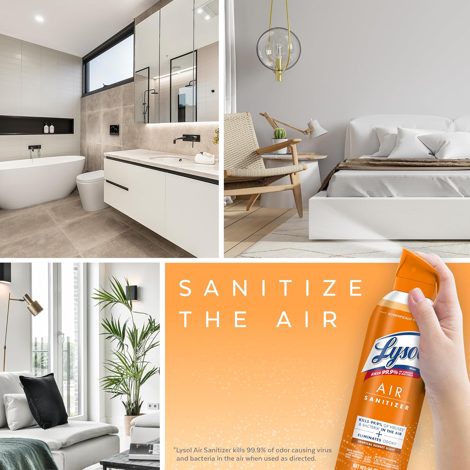 - ANITIZE THE AIR THROUGHOUT YOUR HOME: Lysol Air Sanitizer Spray sanitizes and eliminates 99.9% of odor causing bacteria* in the air. Enjoy tropical sunset scent. (*Use as directed).