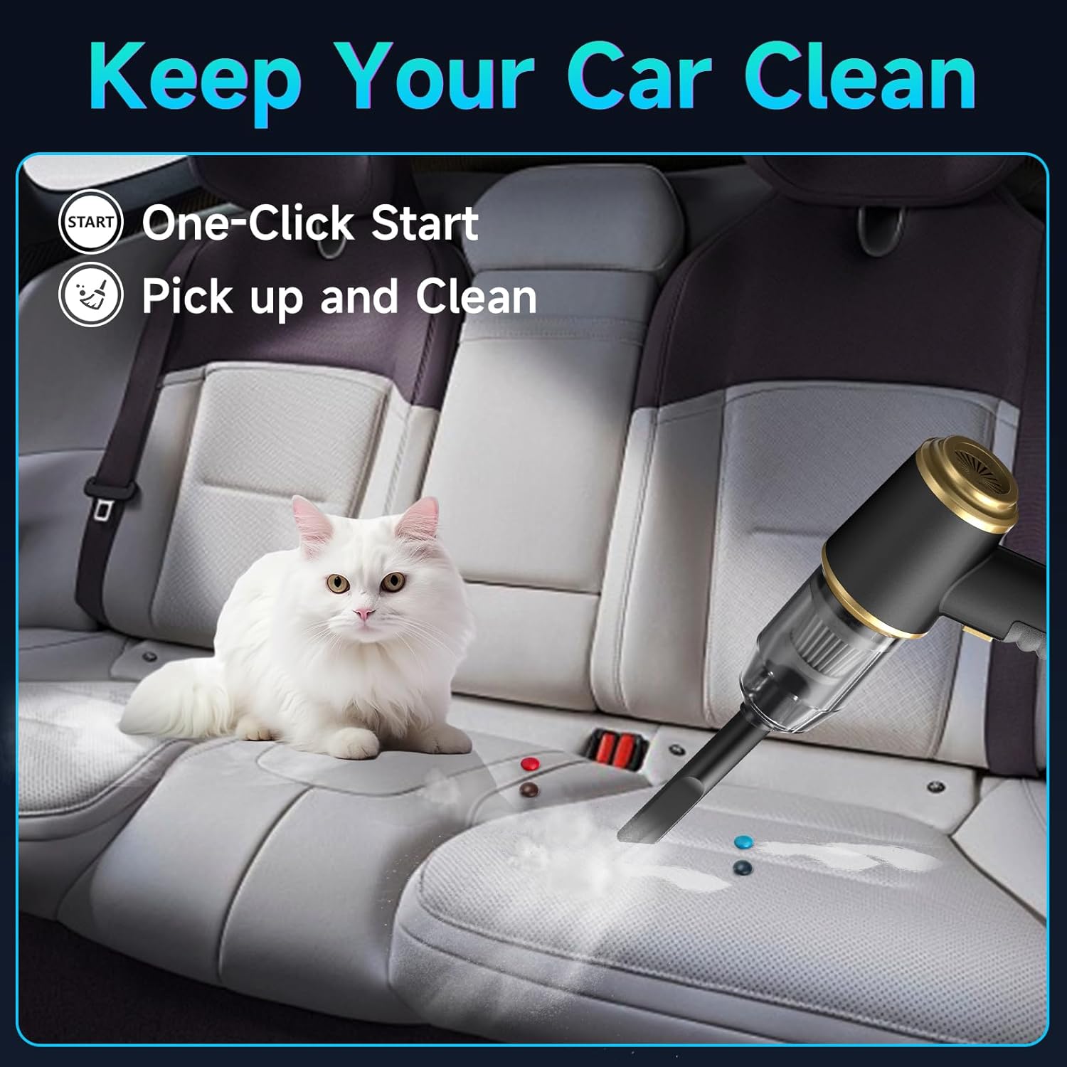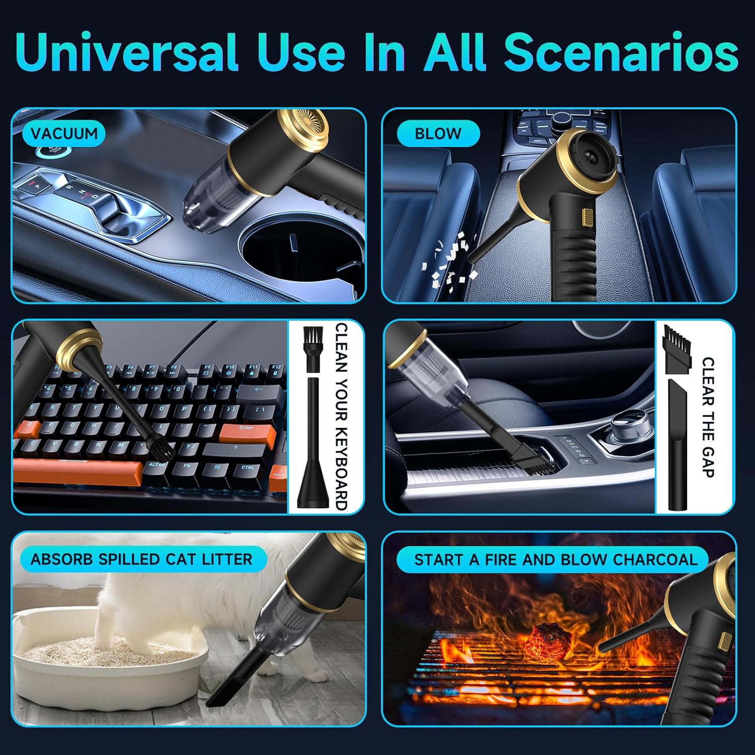 - 4-in-1 Multifunctional: The handheld vacuum cleaner has 5 practical accessories, supporting multiple functions such as vacuuming, blowing, inflating, and compressing. Whether cleaning the keyboard, dusting the gap, around the cat's litterboxes, or inflating the swimming ring, the portable car vacuum can easily cope and meet various cleaning and inflation needs.