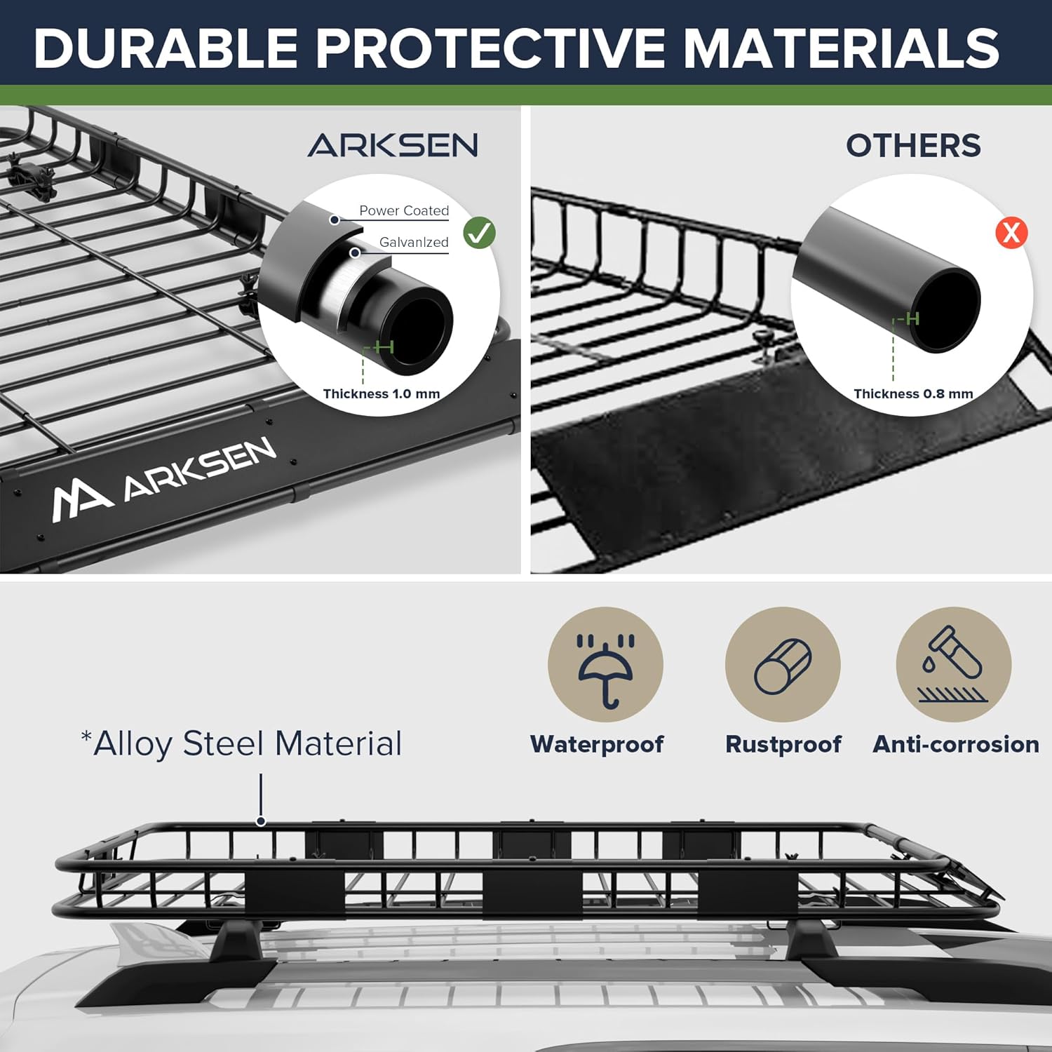 - Heavy Duty Construction: Made from high-strength steel with a 150lbs capacity, this ARKSEN roof rack features a black powder-coated finish for enhanced corrosion and rust resistance.