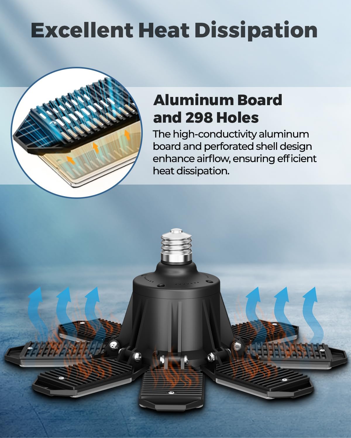 - 8 Foldable Panels + Central LED Board: Enjoy total control over your lighting angle with 8 panels that fold over 90°, plus a central LED board for comprehensive coverage. Aim each panel exactly where you need extra brightness, this garage light fixture illuminates your workbench, storage shelves, or parked vehicles with pinpoint accuracy. This flexible design ensures a consistent, all-around glow throughout your space.