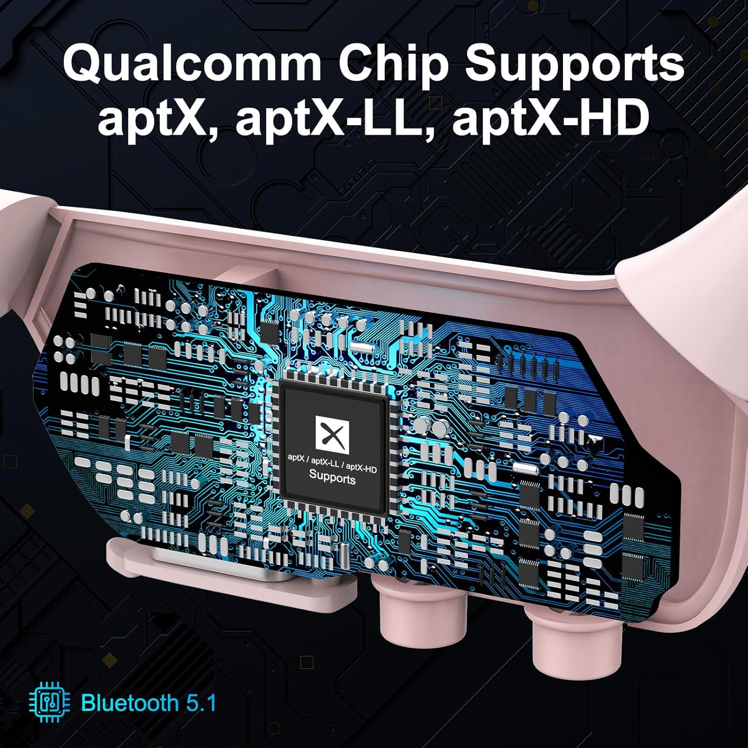 - [QCC3034 Chip|40ms Ultra-Low Latency]: Powered by Bluetooth 5.1 and Qualcomm’s aptX Adaptive technology (supports aptX/aptX-HD/aptX-LL), these open ear headphones deliver seamless audio-video sync with <1 frame delay (40ms). Pair with low-latency bluetooth transmitter for lag-free gaming, movie nights, or live streaming—sound stays perfectly matched to lip movements