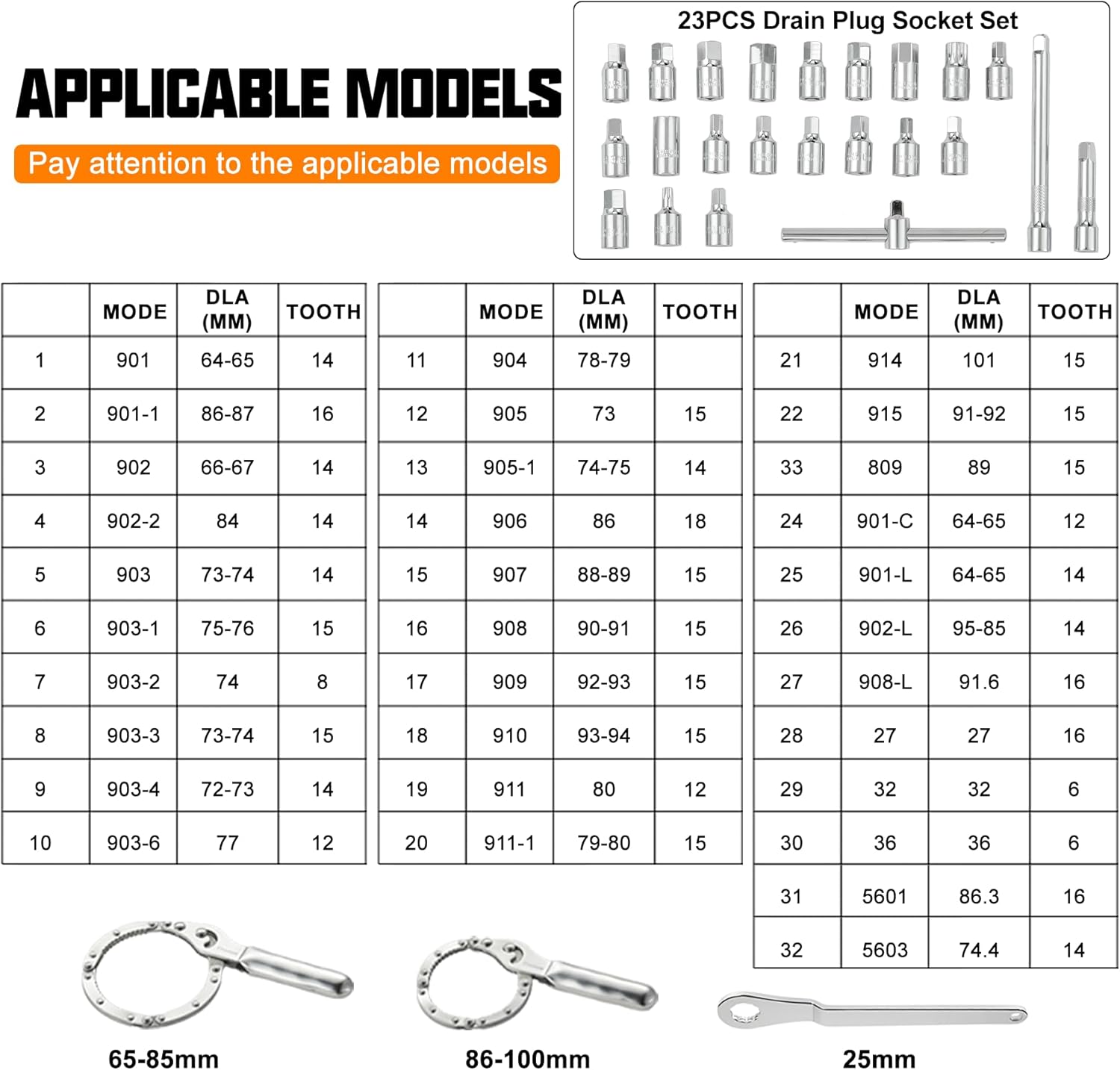 - Comprehensive Kit: This 58PCS set, includes 32PCS Oil Filter Socket , 23PCS Drain Plug Socket Set, 2PCS adjustable wrenches, 1PCS drive wrenches to remove filters from all common car, truck, and SUV models