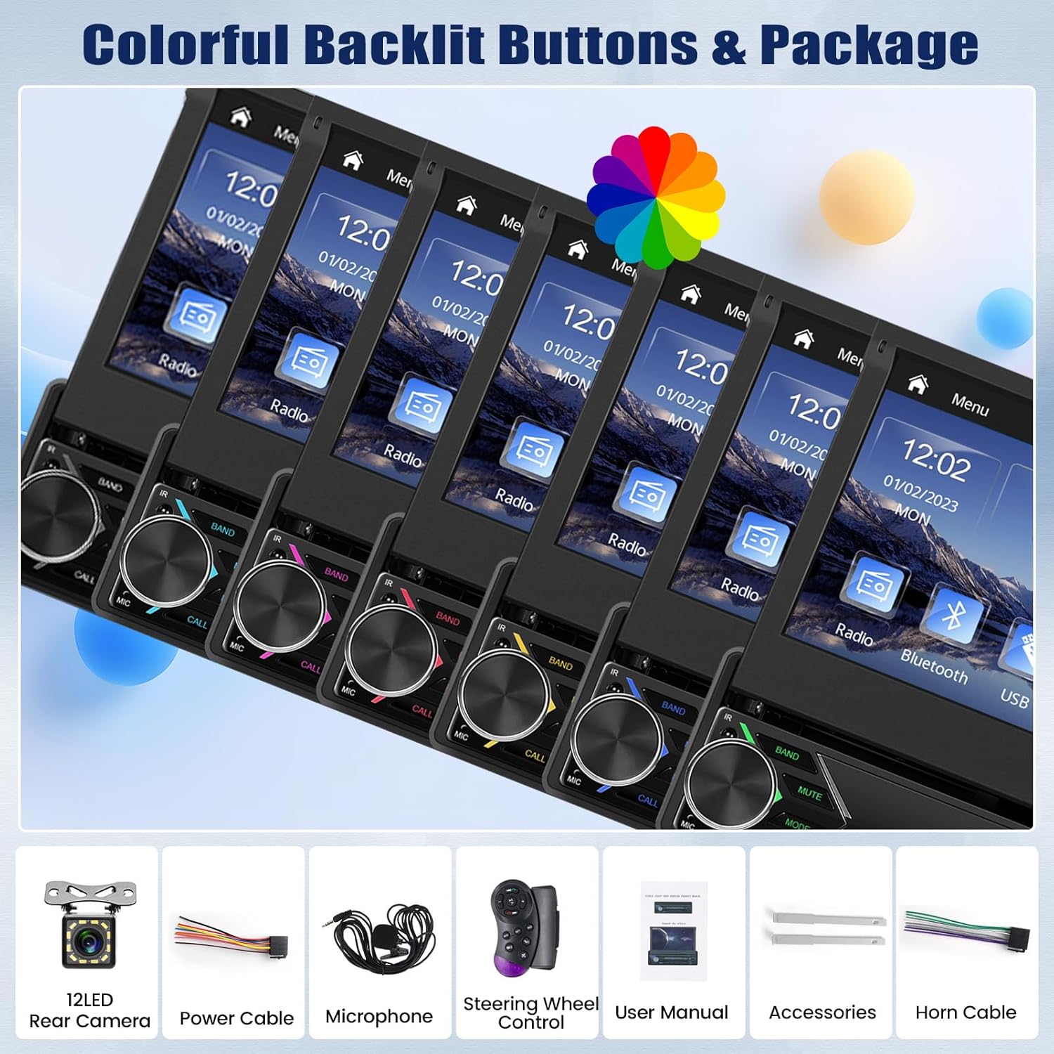 Single Din Touchscreen Car Stereo with Wireless Carplay&Android Auto,7 Inch Car Radio Flip Out MP5 Play with BT FM Radio EQ Mirror Link Car Audio with USB/TF/AUX-in SWC+Backup Camera+Microphone