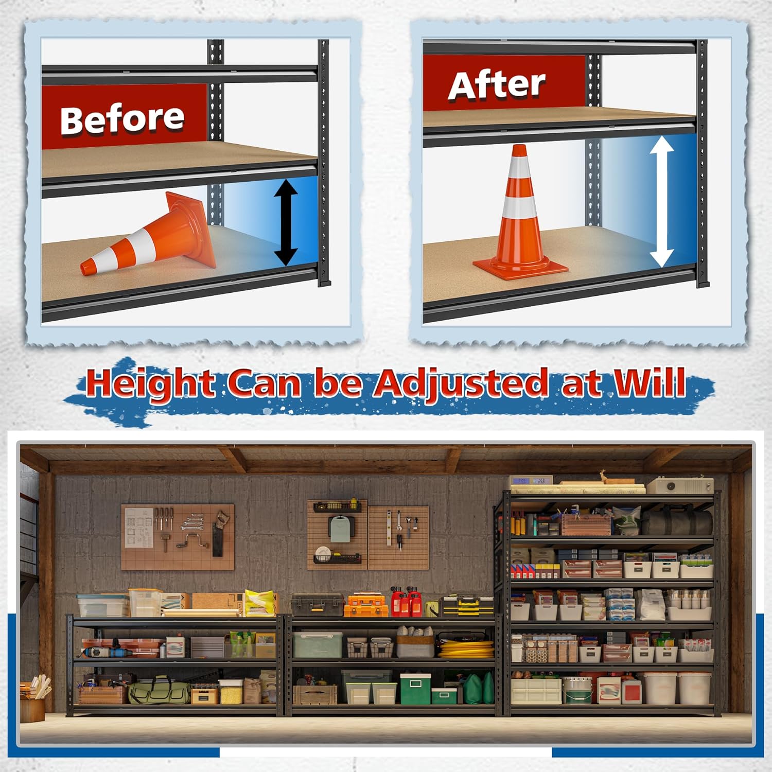 - 【3060LBS Capacity Garage Shelving Heavy Duty】The heavy duty shelving is constructed with reinforced steel legs, featuring a high-grade metal frame paired with 5mm thickened MDF boards. Every shelf of the garage storage shelves, reinforced by 3 support bars, can support up to 510LBS—delivering a total capacity of 3060LBS. The robust load capacity ensures exceptional stability and maximizes storage efficiency